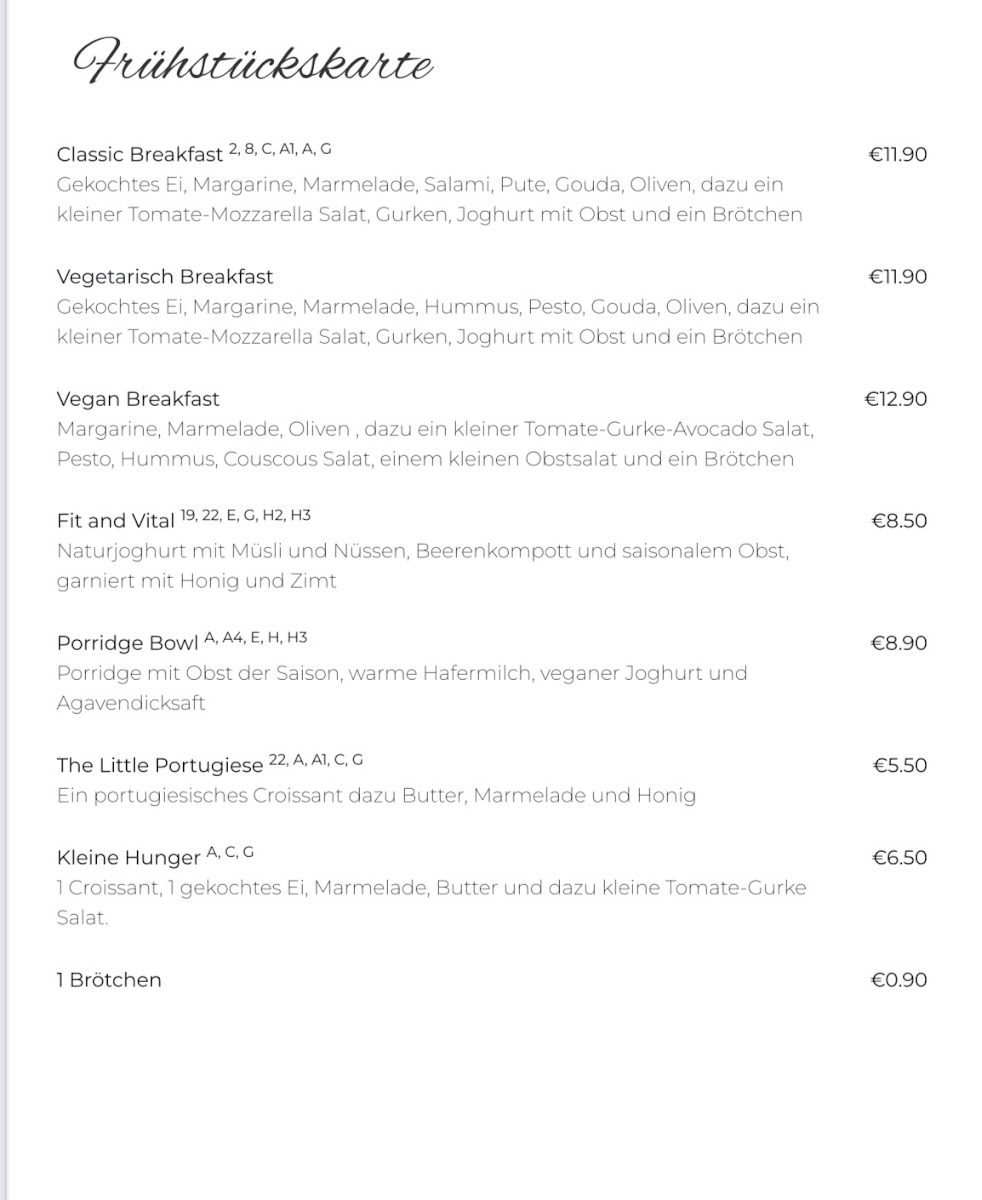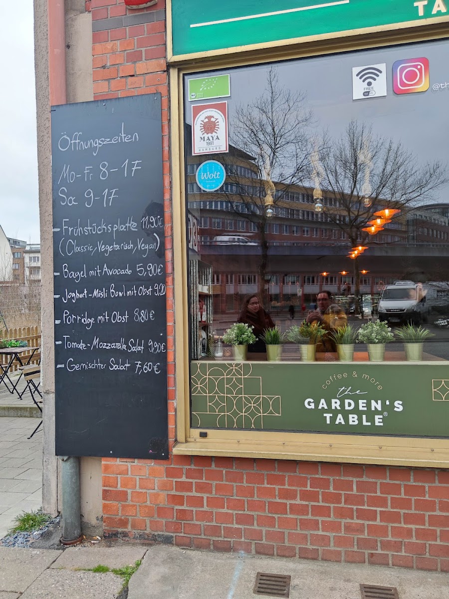 The menu at The Garden's Table focuses on breakfast and cafe offerings, available for morning meals and casual brunch visits. The selection includes a variety of baked goods such as bagels, croissants, Franzbrötchen, and other pastries, suitable for a light breakfast or snack. There are traditional and vegetarian breakfast options, including full breakfast platters and smaller dishes like porridge bowls and granola.