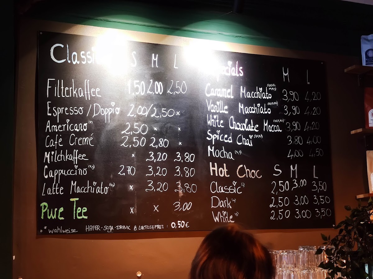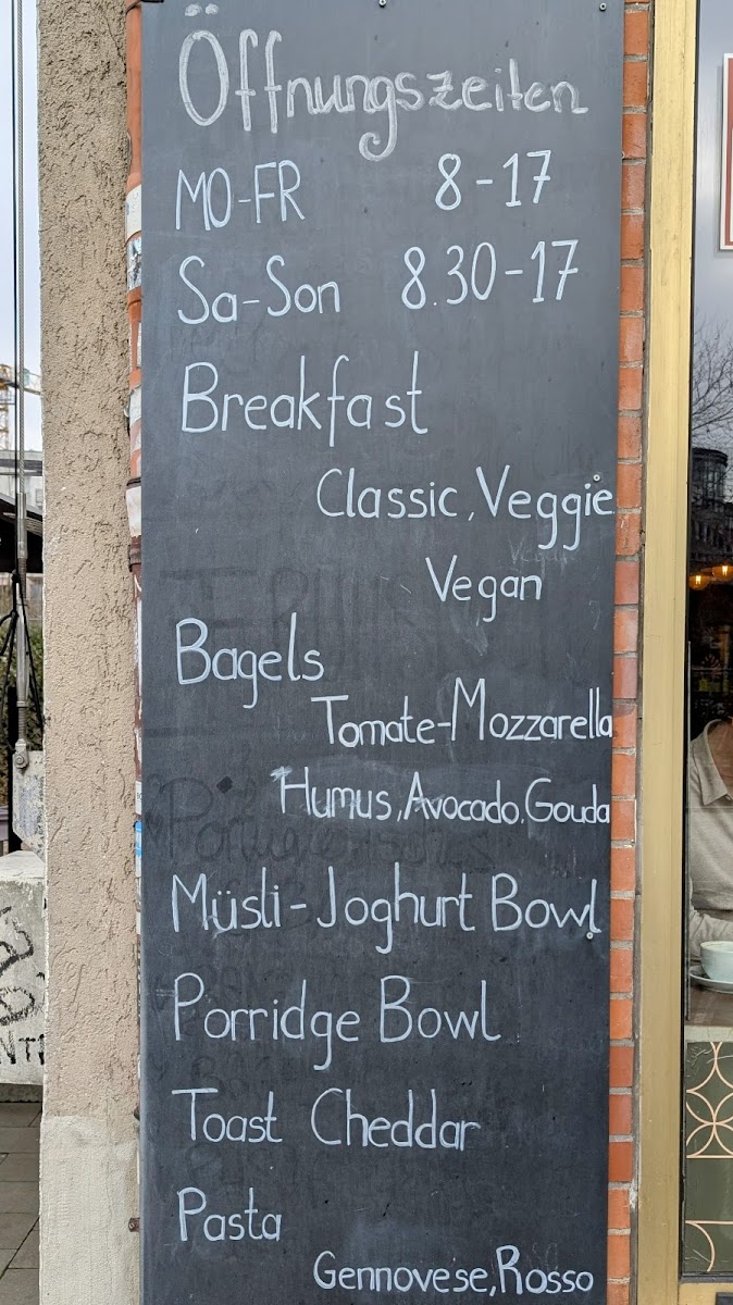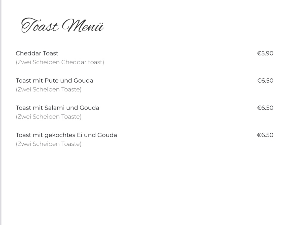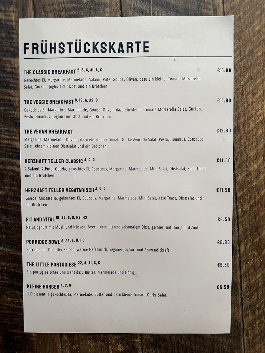 Beverages primarily feature different styles of coffee and specialty drinks. Options include cappuccino, cafe latte, milchkaffee, and unique choices like white chocolate mocha and speculoos latte. Both drink and food items are crafted to accommodate quick breakfast meals or relaxed coffee breaks.