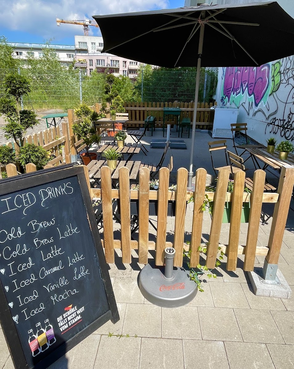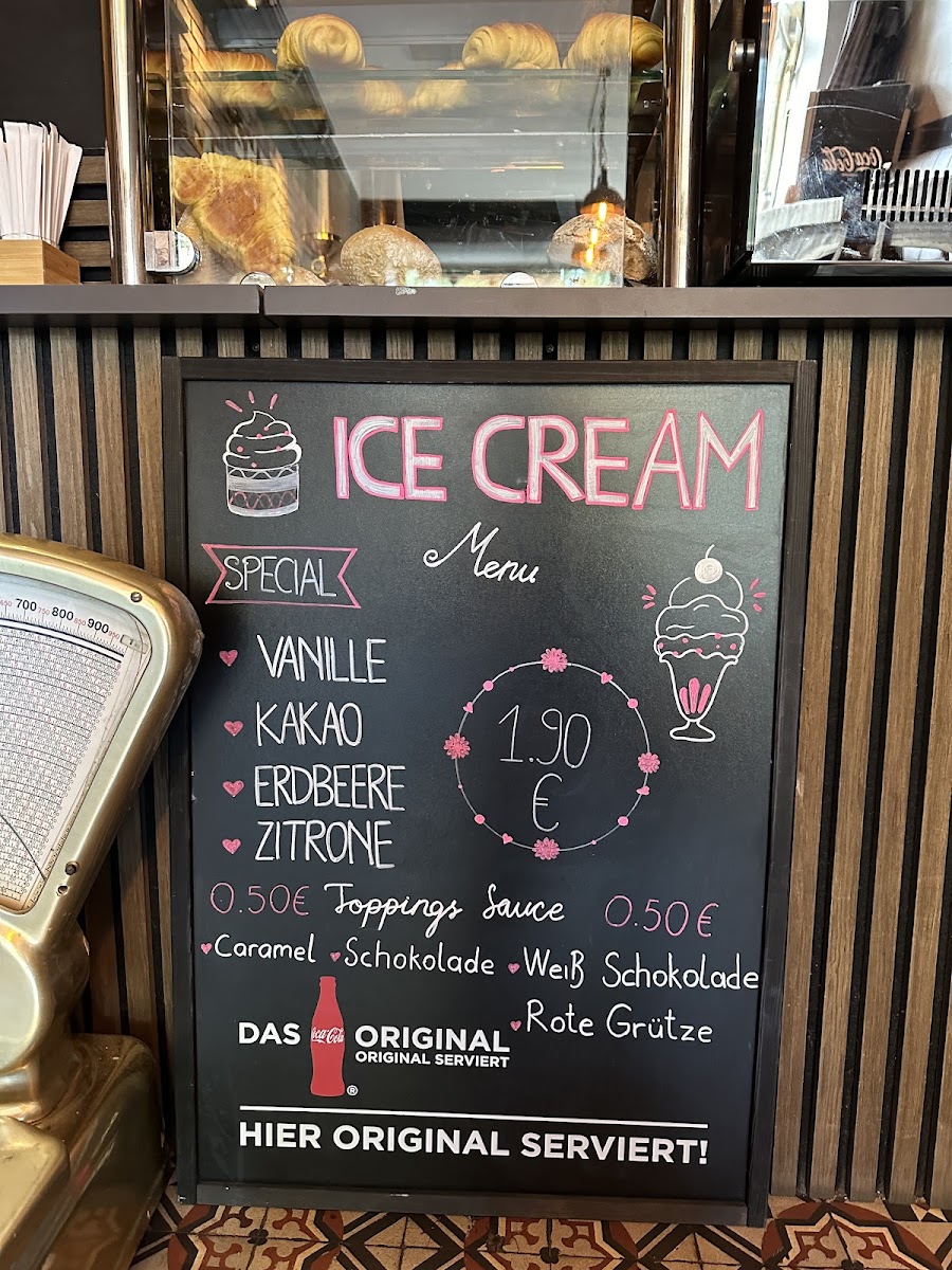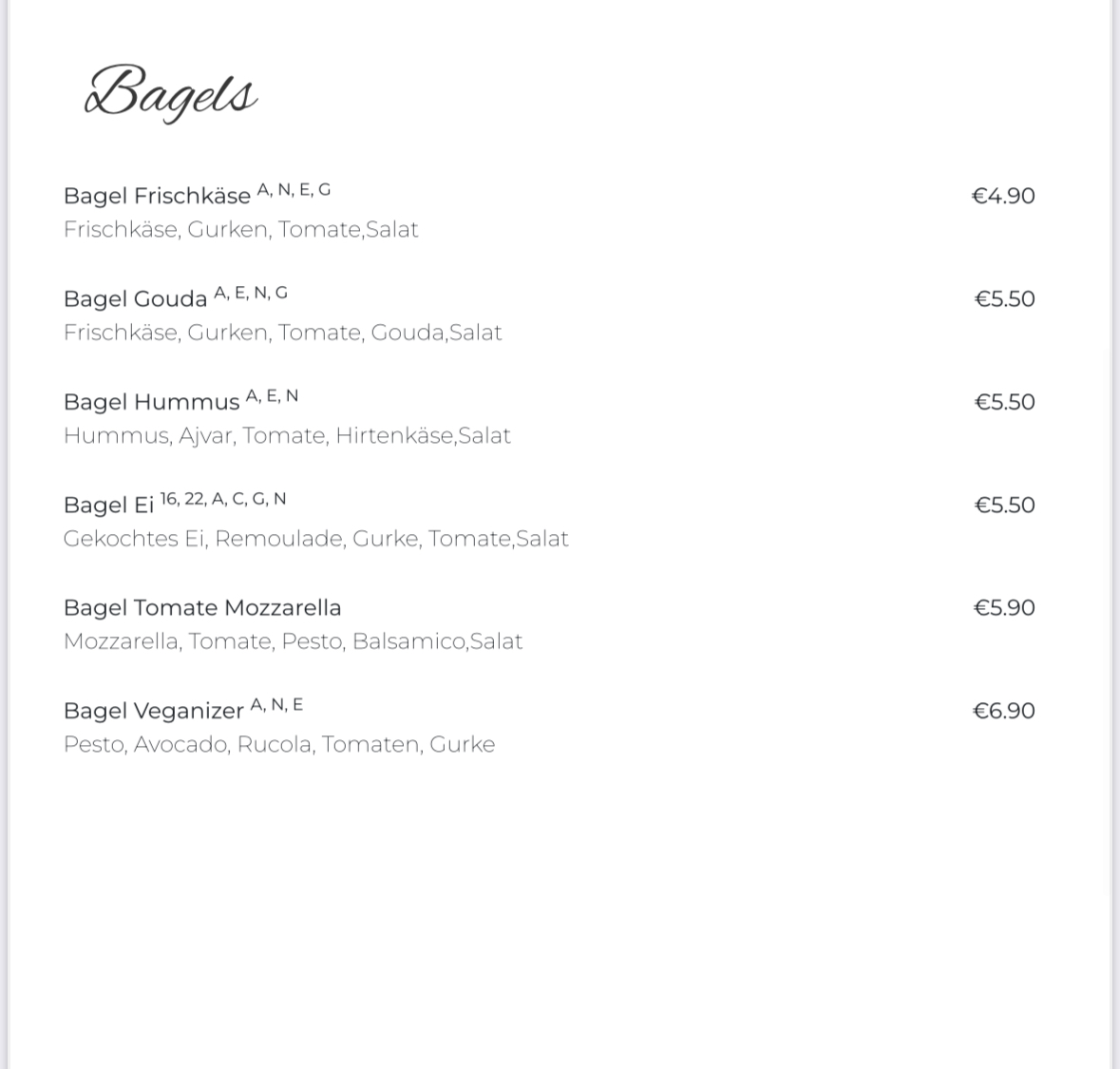 Beverages primarily feature different styles of coffee and specialty drinks. Options include cappuccino, cafe latte, milchkaffee, and unique choices like white chocolate mocha and speculoos latte. Both drink and food items are crafted to accommodate quick breakfast meals or relaxed coffee breaks.